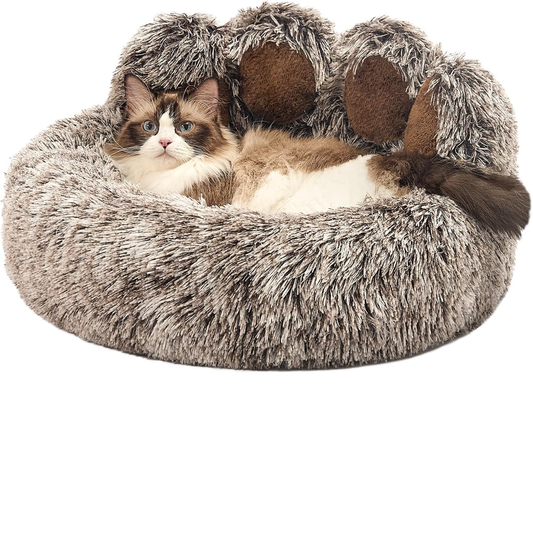 Paw Shape Calming Pet Bed, Plush Faux Fur Donut Bed for Dogs & Cats, Machine Washable, Non-Slip Bottom